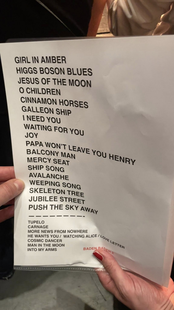 setlist: Girl In Amber, Higgs Boson Blues, Jesus of the Moon, O Children, Cinnamon Horses, Galleon Ship, I Need You, Waiting For You, Joy, Papa Won't Leave You Henry, Balcony Man, The Mercy Seat, The Ship Song, Avalanche, The Weeping Song, Skeleton Tree, Jubilee Street, Push The Sky Away přídavek: Tupelo, Shivers, (Are You) The One That I've Been Waiting For?, Cosmic Dancer, Into My Arms